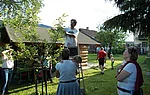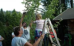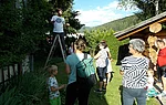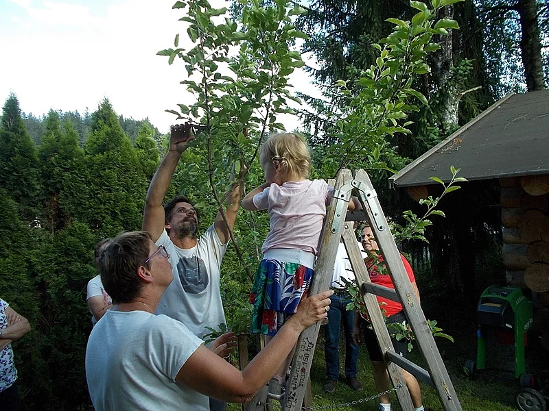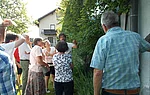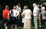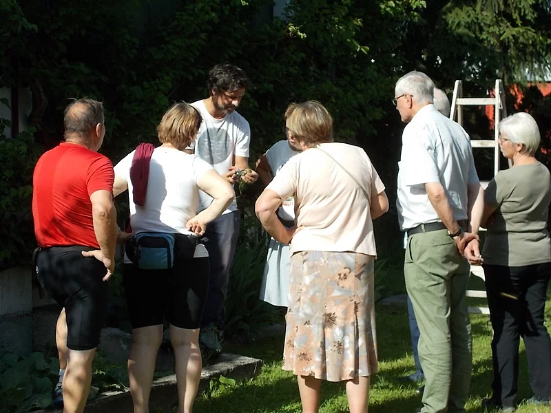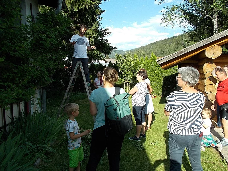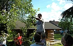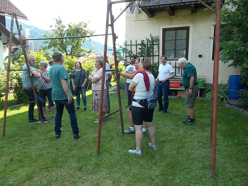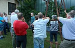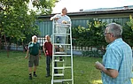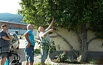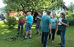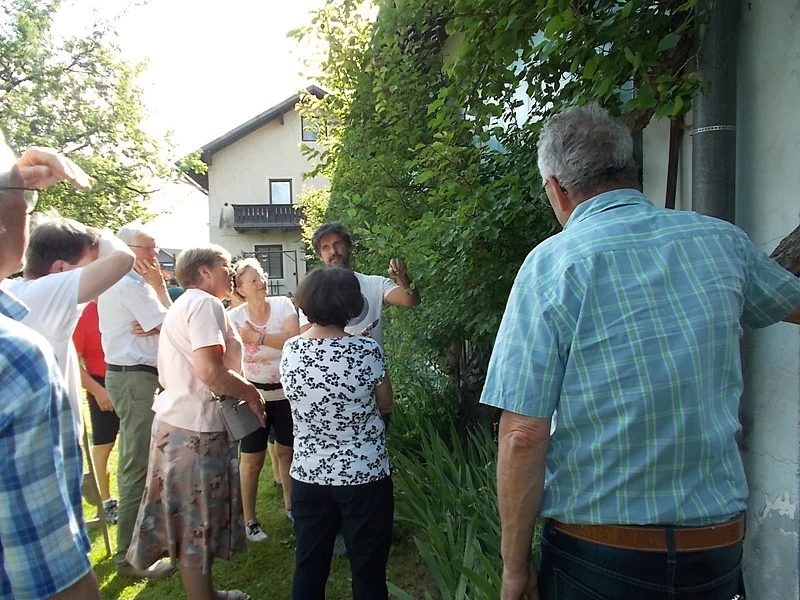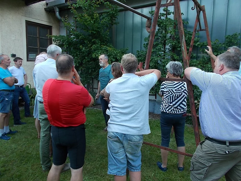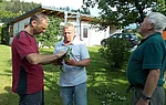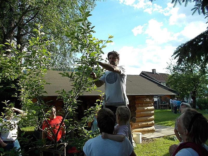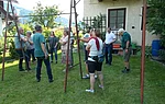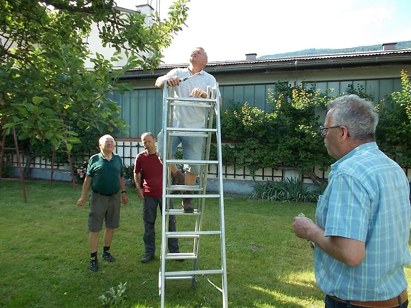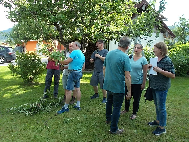 Obmann Dygruber mit den Baumwärtern Gerhard Dygruber und Reinhard Scherübl, zeigen in drei Gruppen den Sommerschnitt am Apfelbaum an der Marille und den Juniriß.