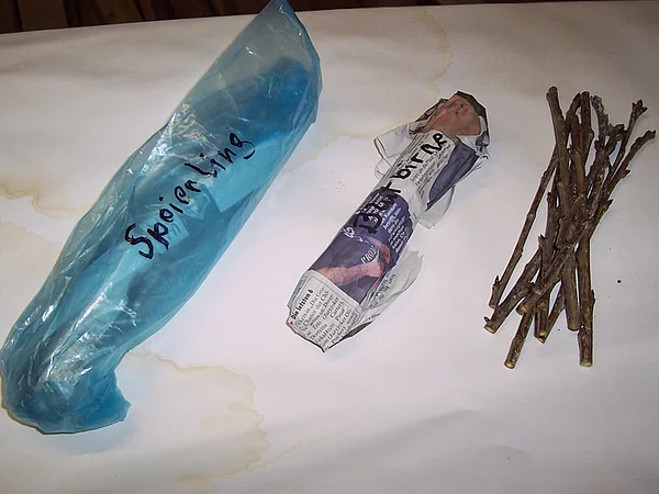 Der verbleibende Mittelteil (ca. Bleistiftdick) wird in gleich lange Stücke geschnitten (ca. 15 cm). Diese werden im trockenen Zustand in Zeitungspapier eingeschlagen bzw. eingerollt und mit einem Gummiband fixiert.