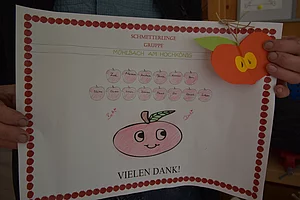 Im Kindergarten erzählten uns die Kinder, welche Köstlichkeiten sie bereits aus den Apfel hergestellt haben bzw. genossen haben. Hier erhielten wir als DANK für unseren Besuch ein tolles, selbstgemaltes Bild. Worüber wir uns sehr gefreut haben.