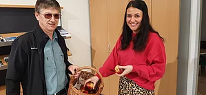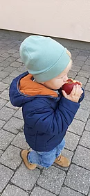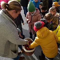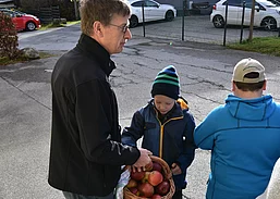 Nach dem Besuch im Kindergarten, führte uns der Weg ins Ortszentrum, wo wir an die Mühlbacher Bevölkerung Äpfel verteilten. Diese kleine, seit Jahren bestehende Geste, zauberte so manchen Mühlbacher ein Lächeln ins Gesicht.