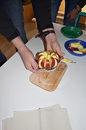 Die Kinder in der Schule erzählten uns was sie bereits alles über den Apfel wußten und im Anschluss durfte sich jeder Schüler/in und Lehrer/in sich am Apfelkorb bedienen.