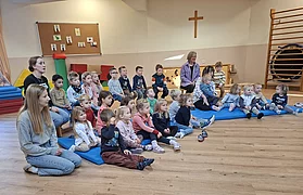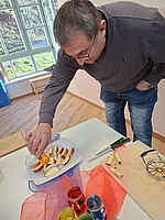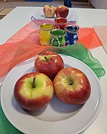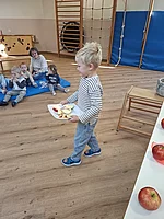 Der erste Halt führte in den Kindergarten. Dort wurden Apfelspalten in Form einer Blume ausgestochen, mit etwas Zimt bestreut und an die Kinder verteilt. Die Begeisterung war groß: Die Kinder ließen sich die Apfelspalten mit Freude schmecken und halfen teilweise sogar eifrig beim Verteilen mit. Zusätzlich erhielt jedes Kind einen Apfel für die Jause. Ein kleiner, aber gesunder Gruß.