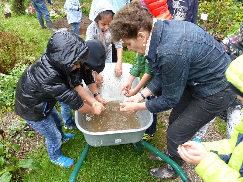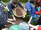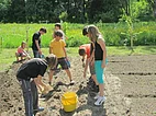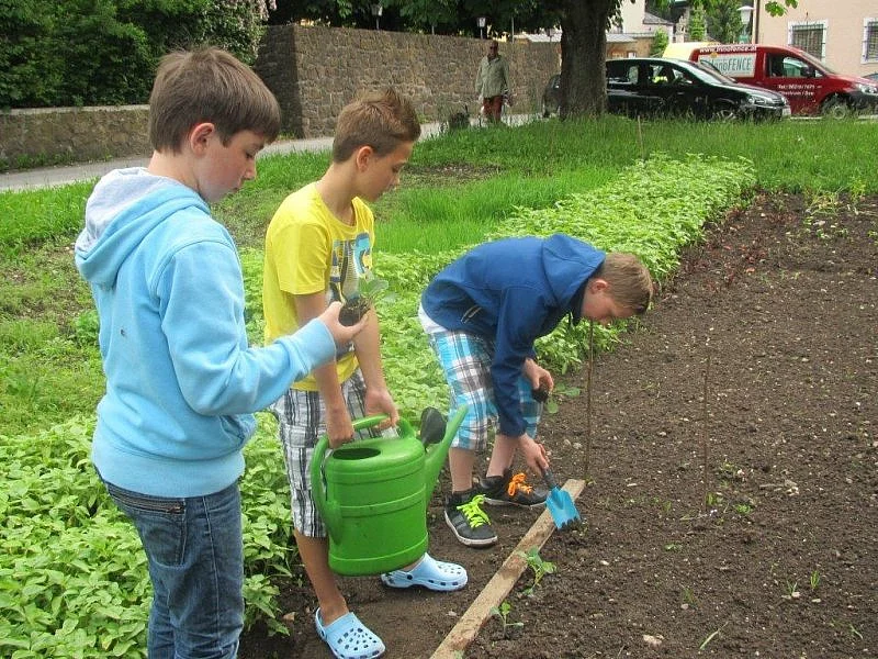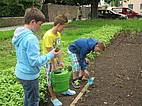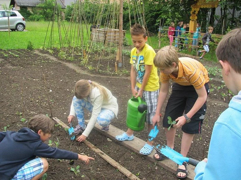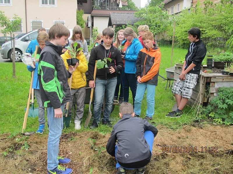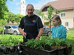 Foto von der Gemüsepflanzung und Verteilung von ca. 160 Tomatenpflanzen an die Schüler/innen für Kübelkultur