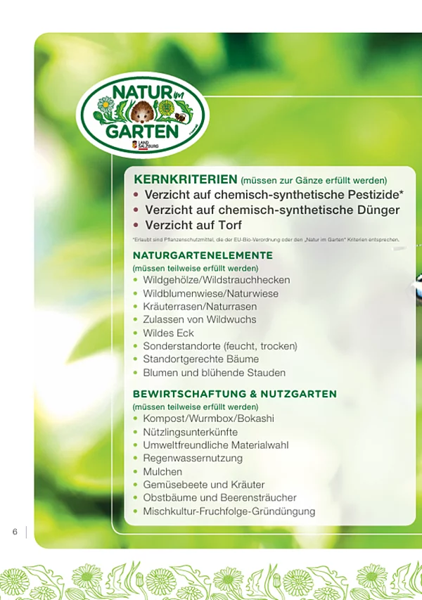 Gärtnerinnen und Gärtner, die sich für eine umweltbewusste und nachhaltige Gartenpflege engagieren, können die offizielle „Natur im Garten“-Plakette erhalten. Die Vergabe erfolgt durch geschulte Mitglieder des Salzburger Landesverbandes für Obstbau, Garten- und Landschaftspflege bei einer persönlichen Gartenbesichtigung. Die Kosten übernimmt das Land Salzburg.