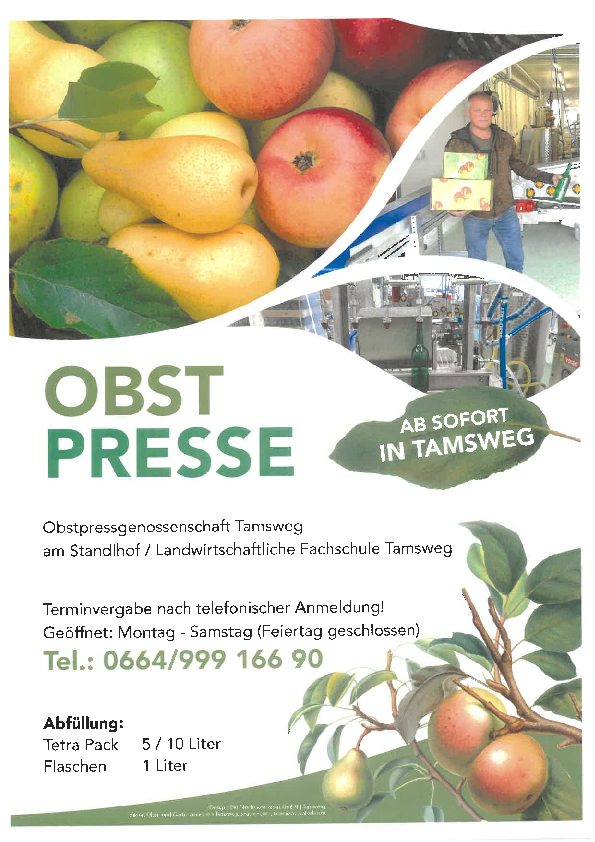Im Juli 2022 wurde vom Vorstand des OGV Tamsweg die Obstpressgenossenschaft Tamsweg gegründet.